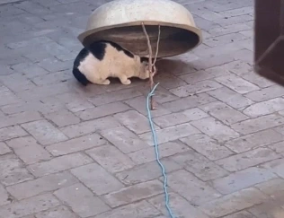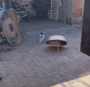마당 한가운데 스테인리스 대야, 작은 나뭇가지, 그리고 누구도 거부할 수 없는 고기 한 점이 살포시 놓여 있습니다. 이 특이한 조합은 호기심 많은 고양이를 유혹하려고 주인이 슬쩍 꾸민 아주 단순한 함정입니다.