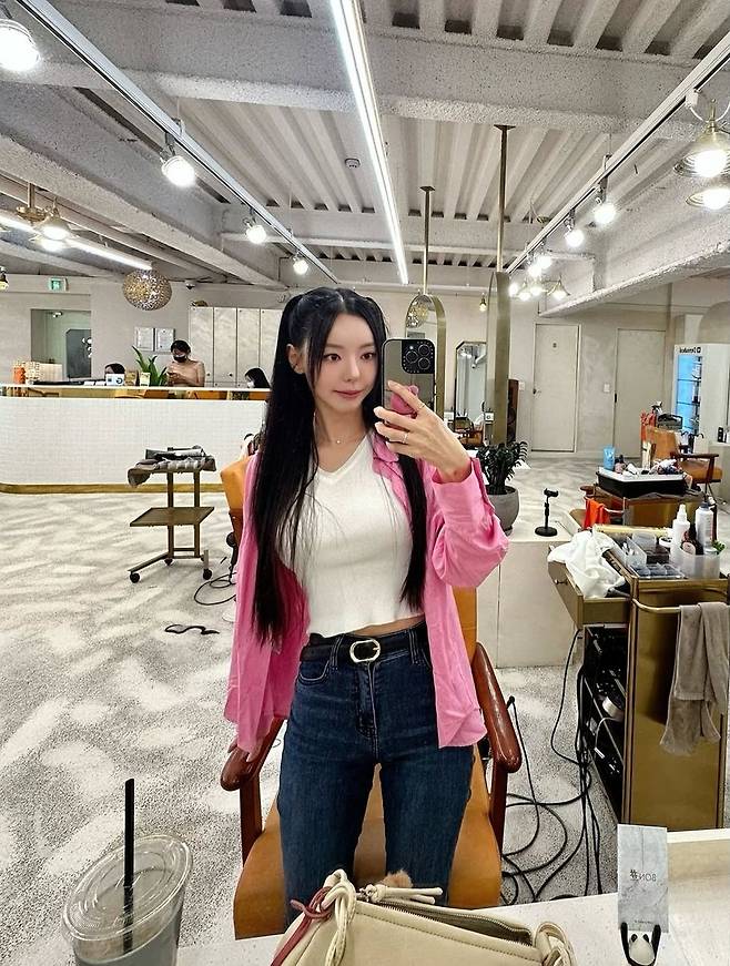 이번 룩의 핵심은 단연 핑크 셔츠다. 상큼하면서도 은근한 존재감을 발산하는 이 아이템은 세리 특유의 러블리한 무드를 강조하며, 캐릭터와 현실을 자연스럽게 연결해준다. 여기에 이너로 화이트 립 니트를 매치해 전체적인 밸런스를 깔끔하게 정돈했다.