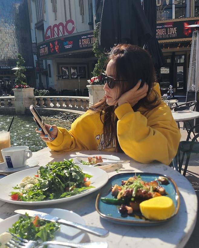 노란색 후드티를 활용한 김희선의 캐주얼 스타일은 편안함과 발랄함을 동시에 연출한다. 테이블 위의 신선한 샐러드와 고급스러운 요리가 어우러진 배경은 그녀의 여유로운 일상을 엿보게 한다. 여기에 자연스러운 헤어스타일과 스마트폰을 활용한 모습은 현대적인 감각을 더하며, 실용적이면서도 트렌디한 분위기를 자아낸다.