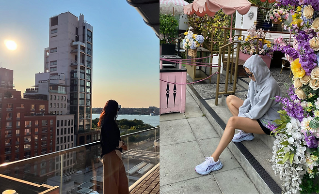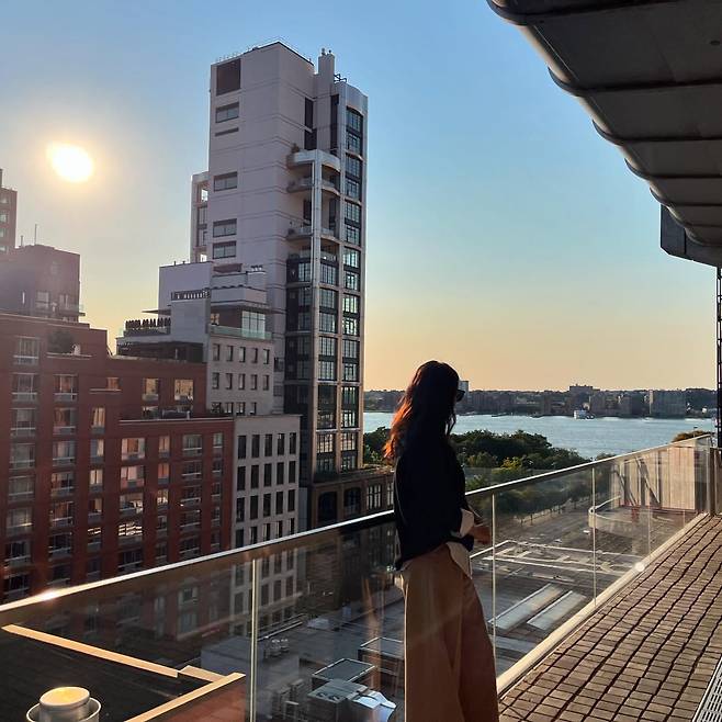 도심의 테라스를 배경으로 한 김희선의 룩은 모던함과 여유로움을 동시에 담고 있다. 어두운 상의와 와이드 팬츠를 매치해 차분하면서도 세련된 실루엣을 완성했으며, 석양 아래에서 도시 풍경과 어우러진 모습은 그녀만의 고급스러운 라이프스타일을 드러낸다.