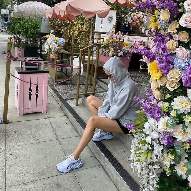 회색 후드티와 운동화를 착용한 김희선은 활동적인 매력을 뽐낸다. 짧은 쇼츠와 편안한 스니커즈는 그녀의 긴 다리를 강조하며, 플라워 데코가 돋보이는 배경과 대비되어 더욱 자유롭고 경쾌한 이미지를 만들어낸다. 자연스럽게 앉아 있는 포즈는 일상 속에서의 편안함을 잘 보여준다.