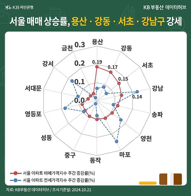 서울 아파트 전세가격지수는 전주 대비** 0.11% 상승 횡보했습니다. 9월까지는 아파트 매매에 대한 관심이 유지되면서 전세 상승률이 다소 완만했습니다. 그런데 10월 들어 전세 공급량 부족 속에 매매수요가 관망세를 보이면서 오히려 전세수요가 강해졌습니다. 강북권이 0.09% 상승했고, 강남권은 0.12% 상승했습니다. 전주 대비 강북권은 0.02%p 상승률이 줄어든 반면, 강남권은 0.02%p 늘어났습니다. 사용가치가 높은 강북권 시장에 가격부담이 생기자 강남권 외곽지역의 상승세가 가팔랐습니다.