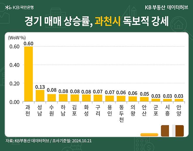 경기 매매가격 상승 순위는 과천시가 6주째 1순위를 유지했습니다. 준(準)강남지역으로 인기가 높은 과천시가 0.60% 올랐습니다. 과천시가 9월 2주차부터 하남과 성남시를 압도하면서 1순위를 탈환하더니 6주 연속 1순위를 유지했고, 상승률도 독보적입니다. 과천시는 재건축 단지들의 활발한 사업추진에 힘입어 수요층의 관심이 최고조로 모아지는 양상입니다. 지난주 8위로 숨 고르기를 진행한 성남시가 다시 2순위를 나타냈습니다. 수원시가 서울에서 가장 가까운 장안구의 강세에 힘입어 3순위를 차지했습니다.