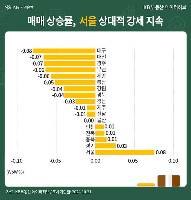 다만 서울은 5월부터 22주째, 수도권은 6월부터 20주째 상승세를 유지 중입니다. 지난주보다 상승률이 서울은 0.05%p, 수도권은 0.03%p 줄었지만, 여전히 상승하고 있습니다. 한편 5개광역시와 지방도시의 전주 대비 증감률**은 지난주 약세 전환에 이어 금주 하락률이 확대되는 등 양극화가 이어지고 있습니다.