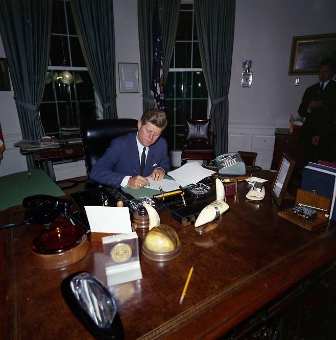 1962년 10월, 세계는 핵전쟁의 문턱에 서 있었다. 소련의 쿠바 미사일 배치는 미국 동부 해안을 직접 겨냥한 위협이었다. 존 F. 케네디 대통령은 침공이나 공습 대신 해상 봉쇄라는 절제된 접근법을 선택하고 서명했다. 이후 소련과의 비공개 협상을 통해 양측 모두 미사일을 철수하는 합의에 도달했다. 위기의 순간에 케네디 대통령이 보여준 냉철한 판단력은 수백만 명의 생명을 구했을 뿐 아니라 국제관계에서 대화와 외교의 중요성을 각인시켰다.