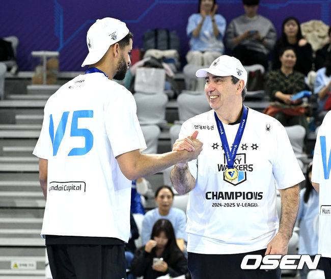 현대캐피탈 필립 블랑 감독이 레오와 인사를 나누고 있다. 2025.04.05 /sunday@osen.co.kr