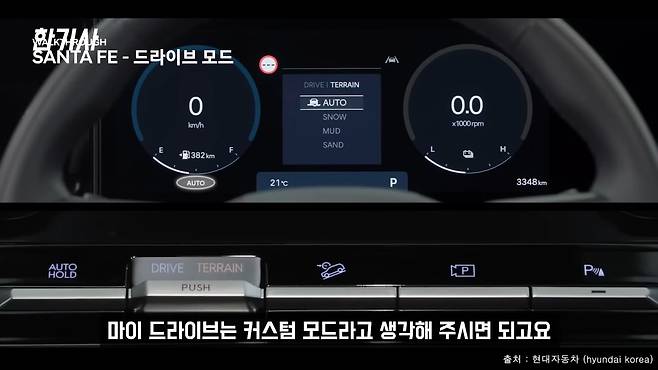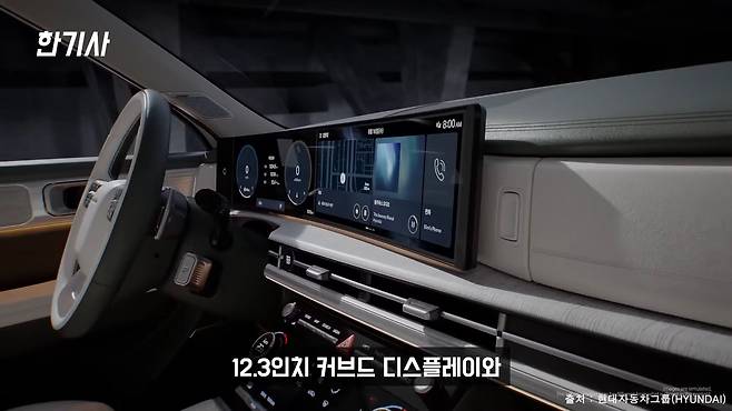디 올 뉴 싼타페 하이브리드의 장점은 실내 디자인이라고 볼 수 있겠습니다. 실내에서 제일 마음에 드는 부분은 12.3인치 커브드 디스플레이와 독특한 핸들 디자인이 마음에 들었고요. 중앙에 현대 마크 대신에 요새 현대차에서 밀고 있는 모스부호 4개가 적용이 된 엠블럼 또한 굉장히 인상 깊게 들어가 있어요.