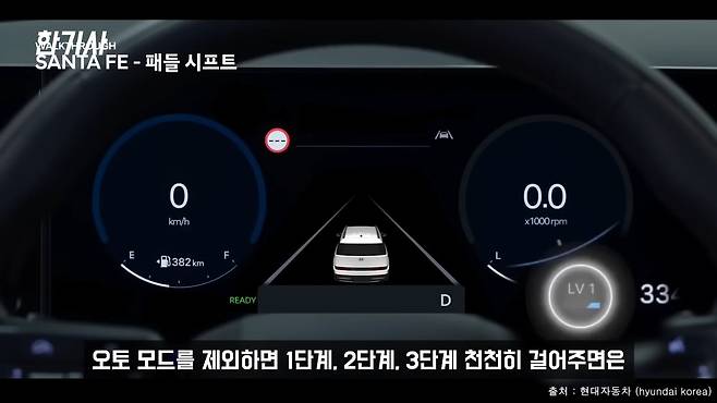 그리고 하이브리드 차량들만의 특징 중에 하나가 정차 시에 좀 급하게 감속하면서 감속되는 에너지를 바탕으로 배터리를 충전하는 회생제동 시스템이 들어가 있어요. 이 부분에 대해서 저는 개인적으로 그렇게 울컥거린다는 느낌은 받지를 않았습니다. 오토 모드를 제외하면 1단계, 2단계, 3단계까지 천천히 걸어주면 옆에 사람도 모를 정도로 이질감이 없고 상당히 만족스럽습니다.