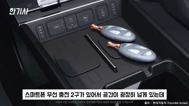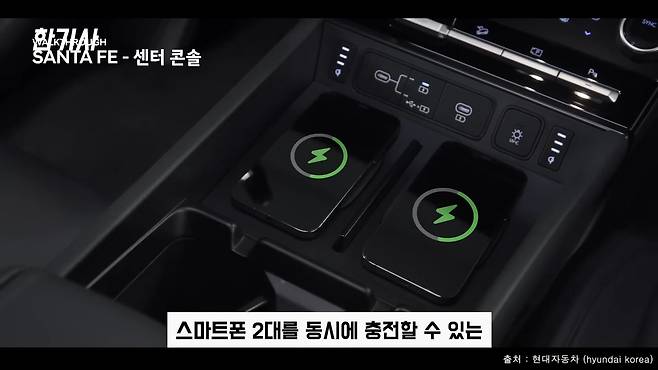 6.6인치 터치식 공조 디스플레이가 쾌적한 실내 환경을 제공을 하고 있고 대시보드를 가로지르고 있는 앰비언트 라이트의 무드등 감성과 더불어서 굉장히 혁신적인 느낌이 실내에서 바로 드는 부분이 센터패시아 쪽에 스마트폰 2대를 동시에 충전할 수 있는 무선 충전 시스템이 적용이 되어 있어요. 다양한 차량을 봐 왔어도 이건 정말 혁신적인 부분이라고 보여요. 인식도 잘 됩니다. 충전 시에 핸드폰에 발열은 조금 있는데 패드에서는 발열이 딱히 없어요.