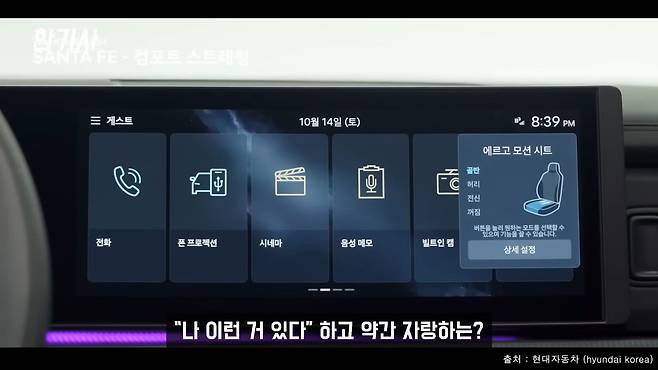 그리고 이 차량 운전석 에르고 모션 시트가 적용이 되어 있는데, 안마 기능은 피로를 풀어준다기보다는 '나 이런 거 있다~' 하고 약간 자랑하는 정도가 되겠습니다. 캘리그래피 싼타페, 5,000만 원 넘는 차량이라는 걸 자랑할 수 있죠.