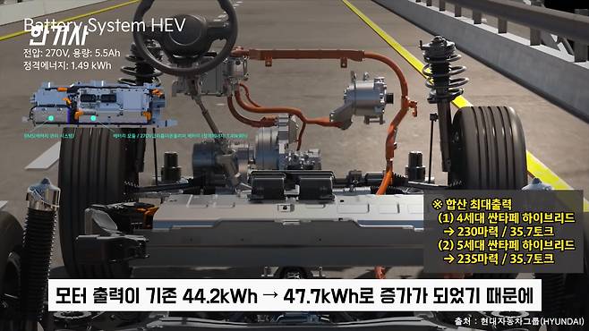 이 차량 4기통 1.6L 싱글 터보 엔진에다가 합산 출력 235마력에 35.7토크를 자랑을 하고 있거든요. 4세대에 비해서 5세대로 넘어오게 되면서 모터 출력이 기존 44.2kWh에서 47.7kWh로 증가가 되었기 때문에 약 5마력 정도가 추가된 점도 차이가 있을 것 같고요. 현대자동차그룹이 자체 개발한 NCM 배터리팩이 현대기아 하이브리드 최초로 탑재된 것도 하나의 포인트로 볼 수가 있어요.