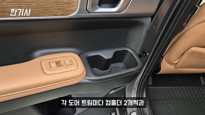 이 차량의 또 다른 장점으로는 실내 공간과 수납공간을 꼽을 수가 있겠습니다. 2열에도 수납공간이 따로 마련되어 있는데 각 도어 트림마다 컵홀더 2개씩과 밑에 가운데 보면 서랍이 있어요. 숨겨진 수납공간이 있다는 걸 말씀드리고 싶습니다.