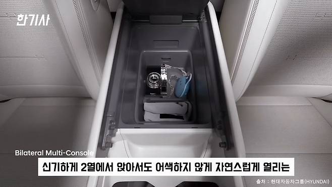 그리고 양방향으로 열 수 있는 멀티 센터 콘솔이 적용이 되어 있고 신기하게 2열에서 앉아서도 어색하지 않게 자연스럽게 양방향으로 열리는 것 또한 굉장히 혁신적인 실내 디자인의 포인트로 볼 수가 있을 것 같아요.