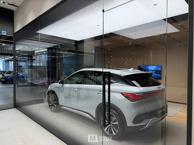 BYD 수원 전시장 오픈식에는 총 4대의 아토3가 전시돼 있었는데, 화이트와 블랙, 블루, 그레이 총 4종에 기본형 및 고급형 모델을 모두 살펴볼 수 있었다. 전시장 입구는 블랙 프레임에 'BYD' 로고 조명이 은은하게 빛나며 깔끔한 분위기를 조성했다.