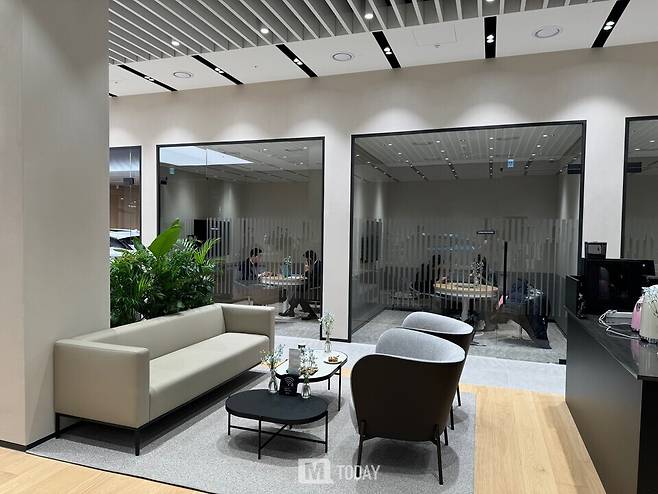 전시장에 들어서면 화이트와 라이트 그레이, 우드의 조합이 모던하면서도 따뜻한 느낌이다. 입구 정면에는 리셉션이 위치하며, 좌측에 마련된 트레이닝 룸, 컨설팅 룸은 전시장 외부와 일체감을 준 블랙 프레임과 면적이 넓은 유리로 꾸며 프라이빗 하면서도 답답해 보이지 않도록 꾸며졌다.