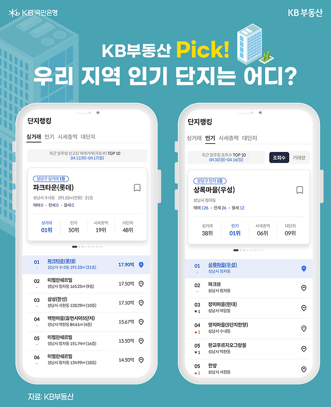 이 외에도 고객님들이 KB부동산에서 어떤 단지를 많이 검색했는지도 확인할 수 있습니다. 가령 최근 일주일 사이 분당구에서 조회수가 가장 높았던 단지는 정자동에 위치한 ‘상록마을(우성)’인데요. ‘파크뷰’, ‘장미마을(현대)’, ‘양지마을(5단지한양)’, ‘판교푸르지오그랑블’도 분당구에서 인기가 높은 단지로 나타나고 있습니다.