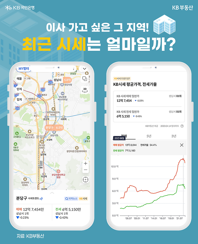 먼저 KB부동산 앱을 작동한 후, 성남시 분당구를 검색해 보겠습니다. 2023년 4월 14일 기준 분당구의 평균 매매가격은 12억7,454만원이고, 평균 전세가격은 6억5,150만원인데요. 두 지표 모두 성남시 내 1위를 기록하고 있습니다.