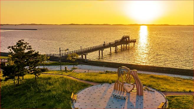 조형물과 함께하는 사진 명소남당노을전망대에서 가까운 거리에 있는 어사리노을공원은 천수만을 배경으로 다양한 산책 시설이 갖춰진 노을 감상 명소입니다.‘행복한 시간’이라는 조형물은 두 남녀의 얼굴에 노을빛이 스며드는 모습을 형상화한 작품으로, 연인들의 인생샷 포토존으로 인기입니다. 갯벌 위 전망대에 올라가면 일몰이 수면 위로 떨어지는 장관도 함께 담을 수 있습니다.