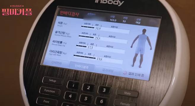 이어 공개된 결과표에서는 키 163cm에 체중이 51.9kg로 나타났다. 특히 체지방률은 17.3%로 표준 이하에 속했고 다리 근육량은 13.8kg로 표준 이상인 것으로 확인됐다.