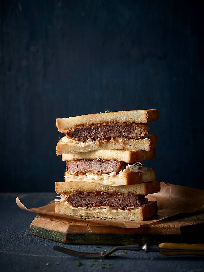 이후 식빵에 스테이크 소스와 홀그레인 머스타드를 바른고 튀긴 한우 등심을 넣으면 완성이다.