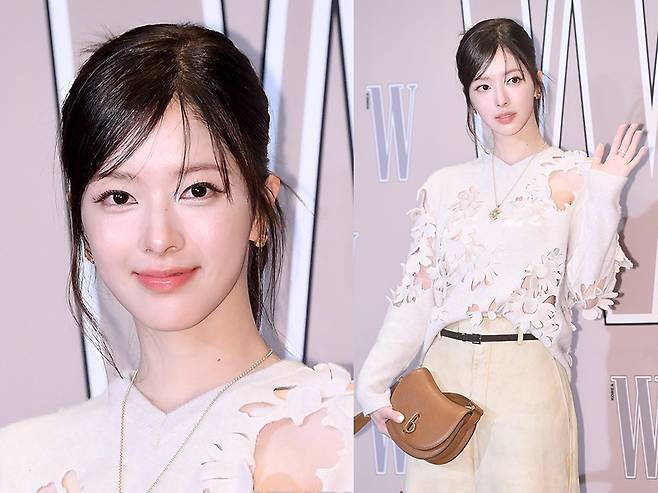 커다란 꽃잎 모양이 돋보이는 컷아웃 디테일이 특징인 화이트 니트를 착용해 로맨틱하면서도 독창적인 감성을 드러냈습니다.