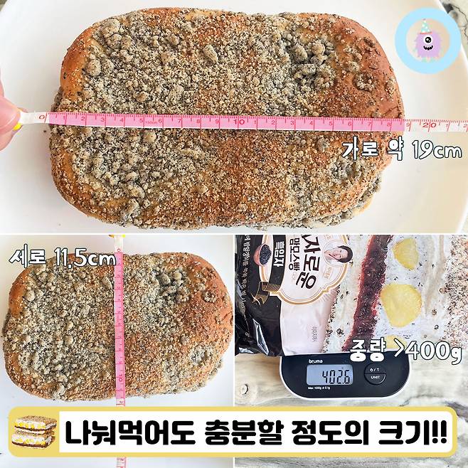 꺼내놓고 보니 훨씬 커서 가로세로 사이즈와 중량을 측정해 봤어요! 가로는 약 19cm, 세로는 약 11.5cm였는데 객관적으로도 정말 큰 사이즈 아닌가요? 빵의 특성상 모양이 일정하지 않을 것이기 때문에 가로 길이가 20cm이거나 그 이상인 경우도 있지 않을까 싶어요.