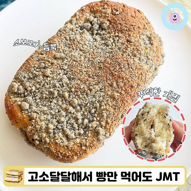 다시 봐도 놀라운 크기의 빵부터 살펴볼게요. 소보로가 듬뿍 흩뿌려져 있어서 고소하고 달달한 맛이 일품이었어요. 흑임자 가루 같은 것이 섞여 있는지 다른 소보로빵에서는 느끼지 못했던 고소한 맛이 나서 너무 맛있었고, 빵만 먹어도 심심하지 않고 JMT이었답니다.