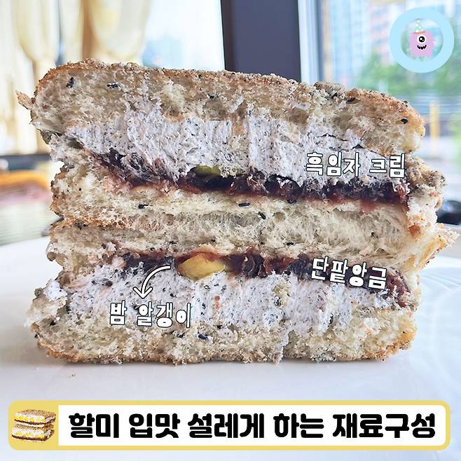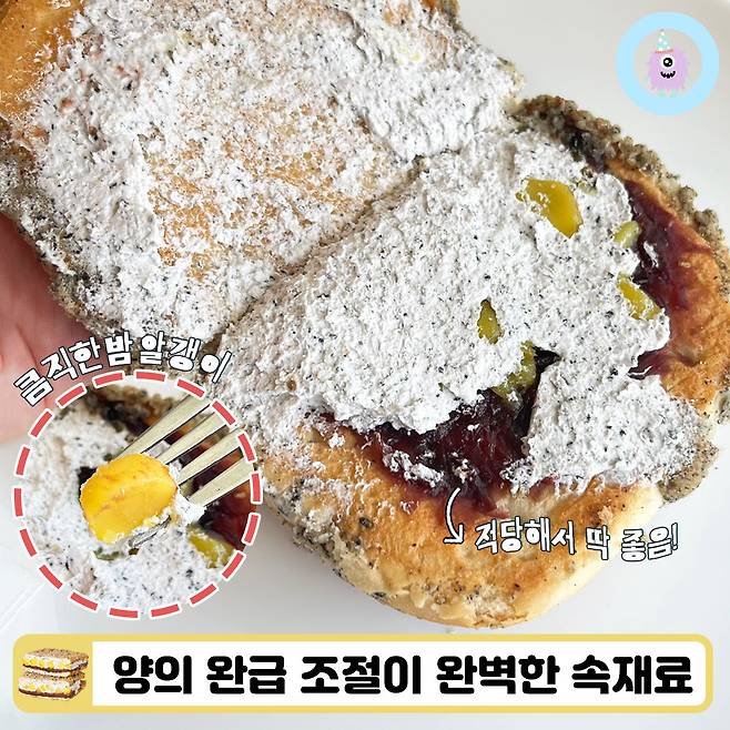 맛은 제가 먹어본 맘모스빵 중에서 최고였어요! 보통 빵도 달고 크림도 달고 팥앙금도 달아서 먹다 보면 질리기 마련인데, 혜자로운 맘모스빵은 거의 모든 재료가 적당히 단 느낌이어서 만족스러웠어요. 팥앙금과 밤 알갱이의 달달한 맛은 고소하고 부드러운 흑임자로 중화되더라구요.