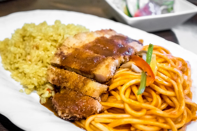 나가사키의 명물이라 하면 카스텔라라고도 할 수 있지만, 도루코라이스도 유명한데요. 도루코라이스는 나가사키 짬뽕, 카스텔라와 마찬가지로 서양 문물을 일찍이 받아들였던 개항 도시 나가사키의 다양한 문화 속에서 생겨난 음식으로, 밥+나폴리 탄 스파게티+돈가스를 함께 먹을 수 있는 나가사키 대표 요리라할 수 있죠.