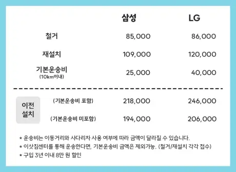 이 과정에서 제조사의 정식 이전 설치 서비스를 이용해야 하기 때문에, 이삿짐센터 비용 외 추가로 비용이 발생합니다.