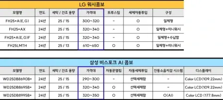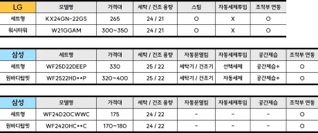 기존에 출시한 세탁기와 건조기를 세트로 묶음 판매하는 형태이다 보니, 스펙이 동일하다면 타워형과 일체형에 비해 저렴한 편인데요.