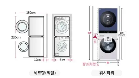 설치 키트에 따라 다르지만, 세트형은 범용 스태킹 키트를 사용할 때 가장 큰 용량 기준 220cm의 천장 높이가 필요합니다. 같은 용량의 타워형은 그보다 낮은 200cm 공간에도 설치가 가능하며, 낮아진 높이 만큼 건조기에 세탁물을 넣고 뺄 때 까치발을 드는 경우가 적습니다.