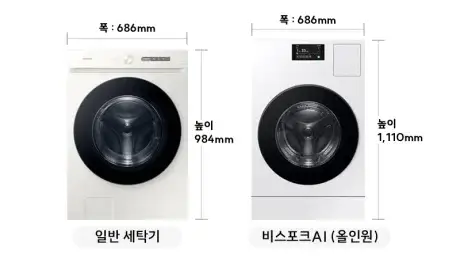 일체형 세탁건조기는 세탁기와 건조기가 드럼 한 개를 공유하기 때문에 그만큼 제품의 크기가 작아져, 25kg 용량 세탁기를 설치할 수 있는 공간이라면 대부분 설치가 가능한 크기입니다. 삼성의 일체형 세탁건조기는 동일 용량 세탁기에 비해 높이가 11cm정도 길어졌지만, 설치 공간에 영향을 받을 정도는 아닙니다.
