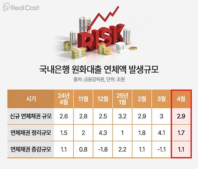 4월 중 신규연체 발생액은 2조 9000억 원으로 3월(3조 원)과 비교해 1000억 원 줄었으며 연체채권 정리 규모는 1조 7000억 원으로 3월(4조 1000억 원)대비 2조 4000억 원 감소한 것으로 확인됐습니다. 신규 연체율의 경우 0.12%를 기록하며 전월과 유사한 수준을 보였습니다.