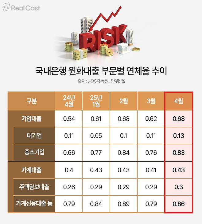 27일 금융감독원이 발표한 4월 말 국내은행의 원화대출 연체율 현황(잠정)에 따르면 국내은행 원화대출 연체율(1개월 이상 원리금 연체 기준)은 0.57%로 3월 말(0.53%) 대비 0.04%p 상승한 것으로 나타났습니다. 24년 4월(0.48%)과 비교해서는 0.09%p 올라간 수치입니다.