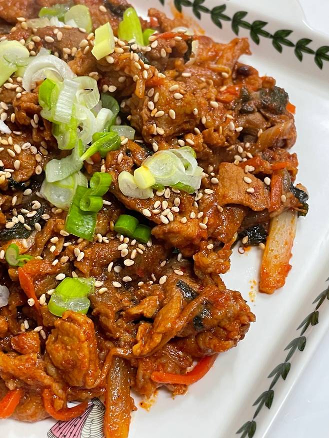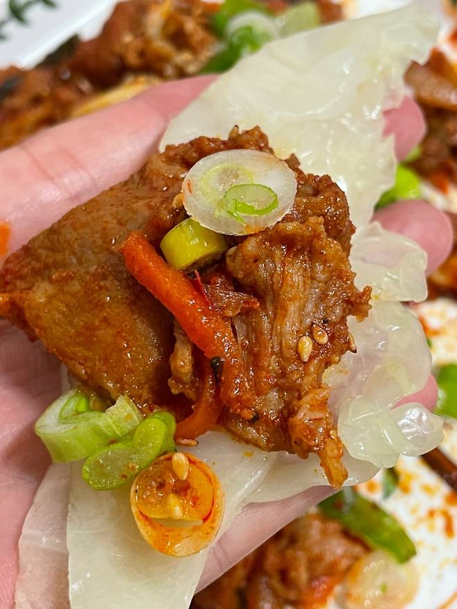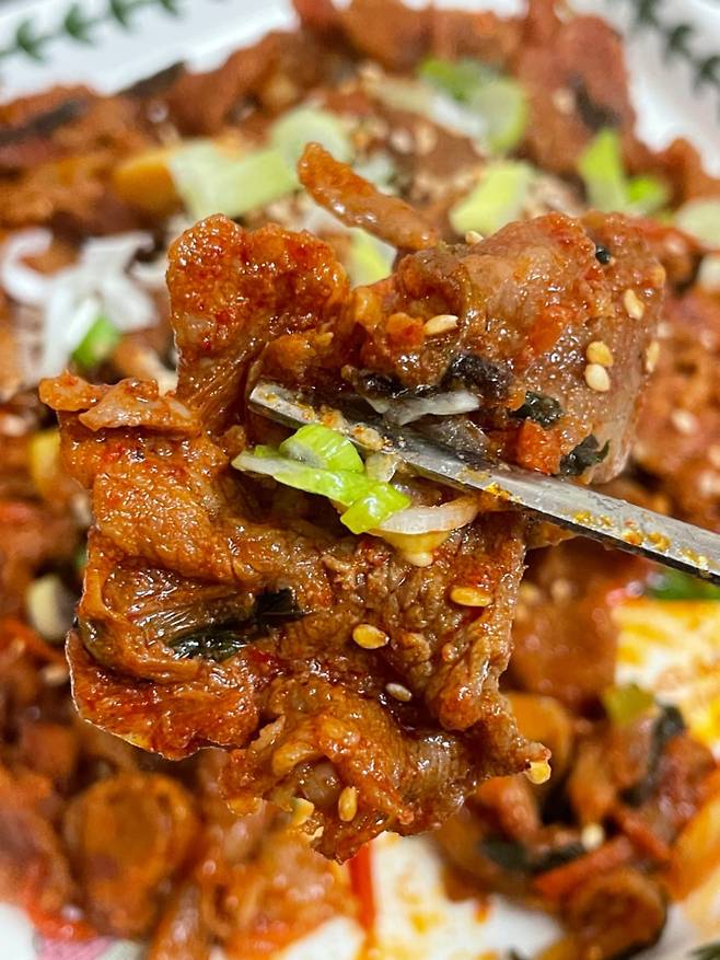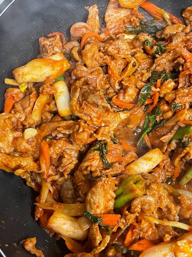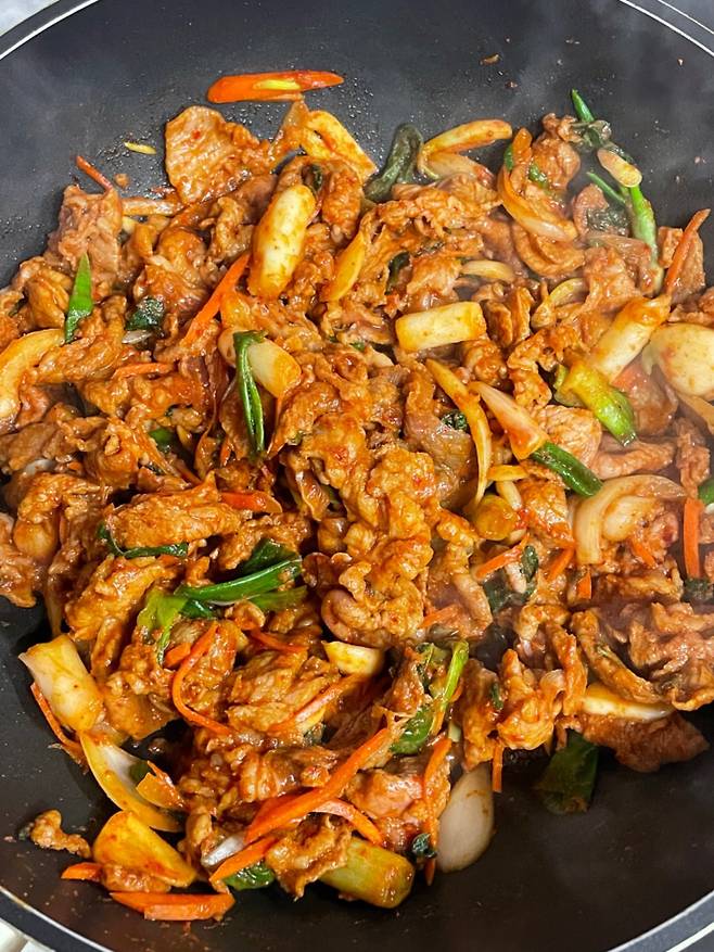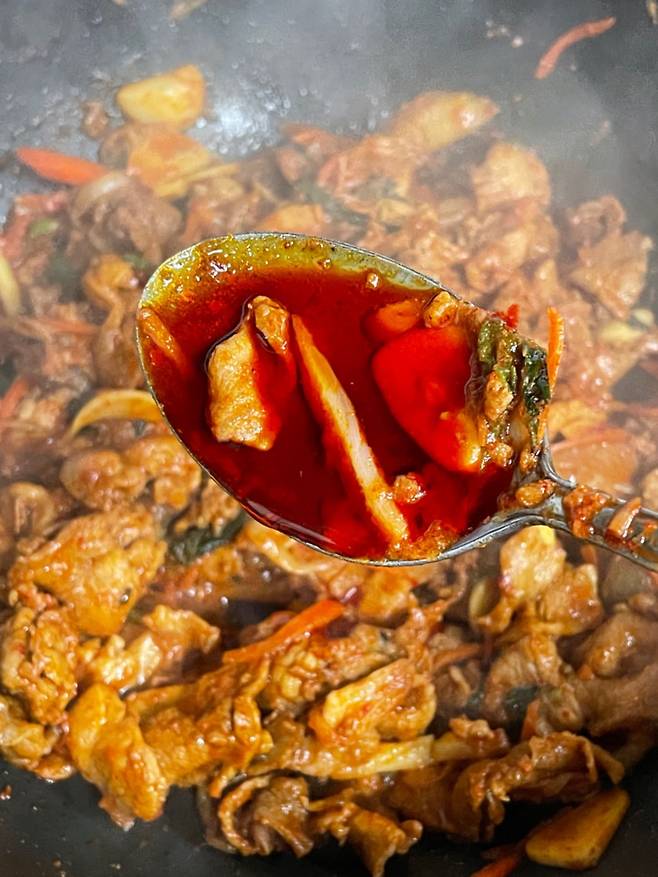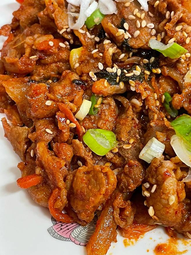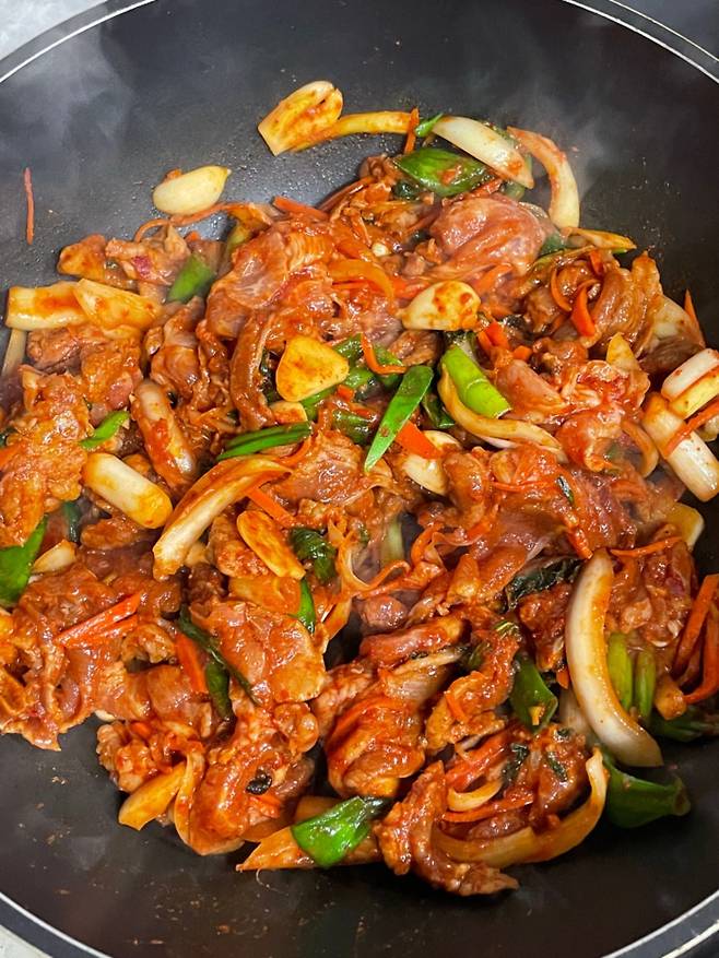 한시간 숙성후 불판에 촤르륵 냄새좋고요 다 익어가는 마지막에 화유 한숟갈 넣었더니 불맛! 군침이 확 ㅎ