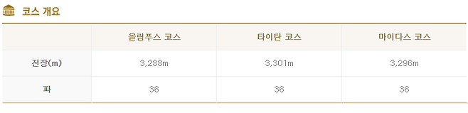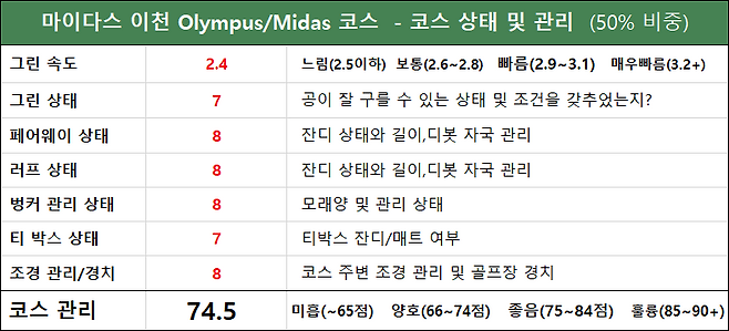 나무도 적당히 있는 오픈형 골프장입니다. 양옆으로 빠져도 해저드 처리되는 홀이 많았고 해저드 티를 사용할 수 있어서 운이 좋으면 파/보기로 스코어를 관리할 기회도 있습니다. 고저차가 적은 골프장으로 티 샷을 잘 보내면 장타자에게 유리한 코스입니다. 난이도는 마이다스 코스보다 올림푸스 코스가 약간 더 있게 느껴집니다.