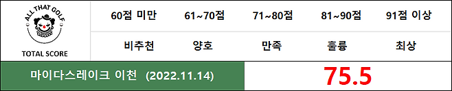 봄, 여름, 가을, 겨울 4계절 모두 마이다스 CC를 경험해 봤는데 항상 기대 이상으로 관리와 재미를 선사하네요. 초. 중급 골퍼에게 잘 맞을듯하며, 상급자 골퍼에게 블루 티 이상의 플레이로 즐거움을 만끽할 수 있을 골프장입니다.