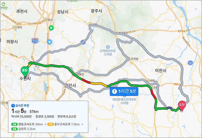 ▶ 이동 거리 / 접근성: 8점 (수원시청역 >> 마이다스레이크 이천 CC)