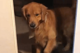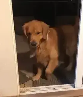 집 안으로 들어오고 싶어 하는 골든 리트리버가 있습니다. 강아지는 눈앞에 아무것도 없는데도 자신을 막고 있는 투명한 장벽에 당황해합니다.