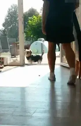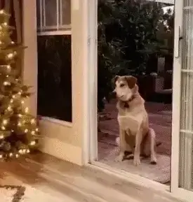 주인이 문을 열어주자 강아지는 믿을 수 없다는 듯한 표정으로 망설입니다. 투명한 장벽이 사라진 것을 보고 의심스러운 눈빛으로 조심조심 앞으로 나아갑니다.