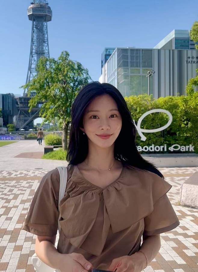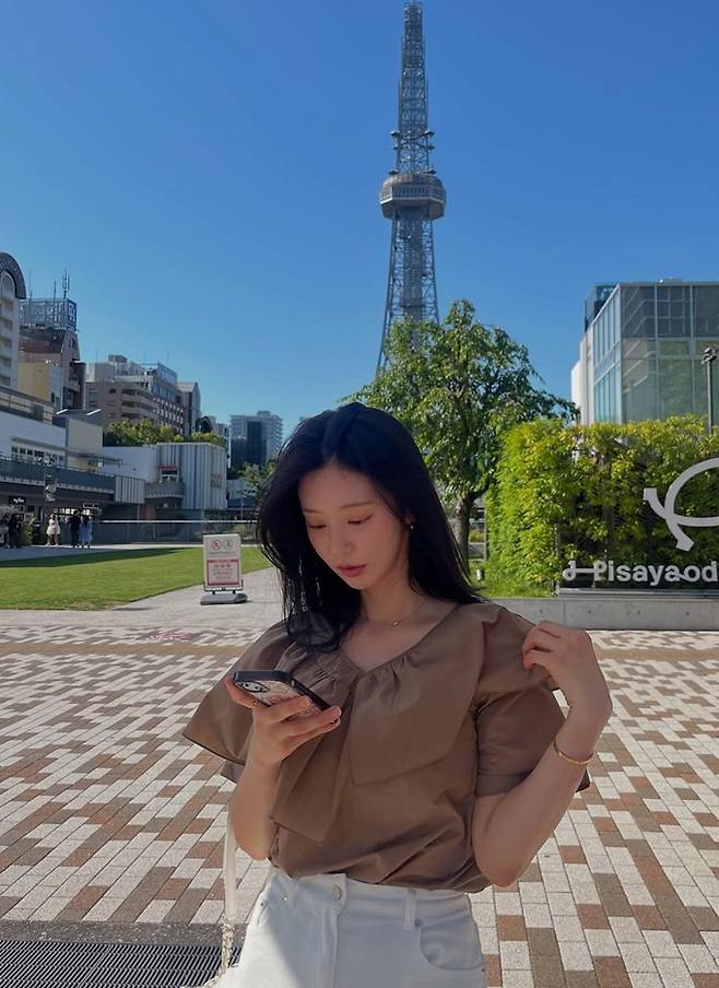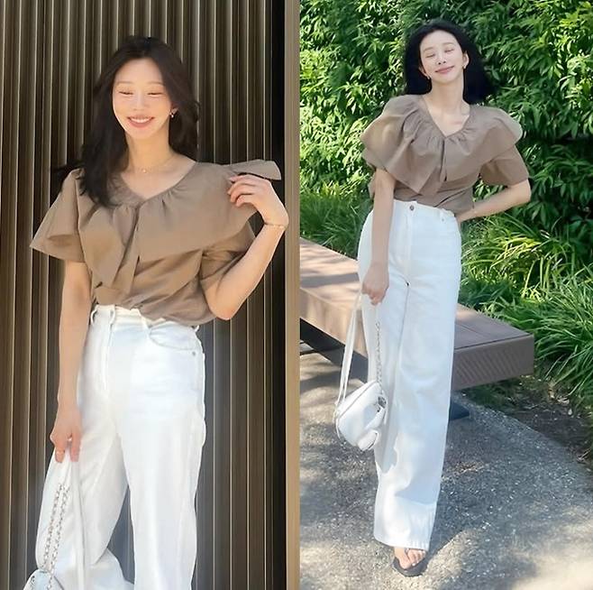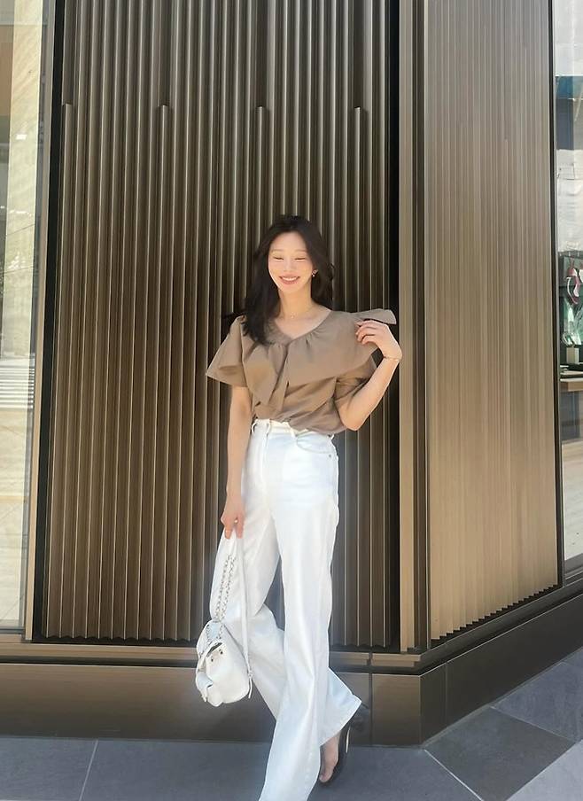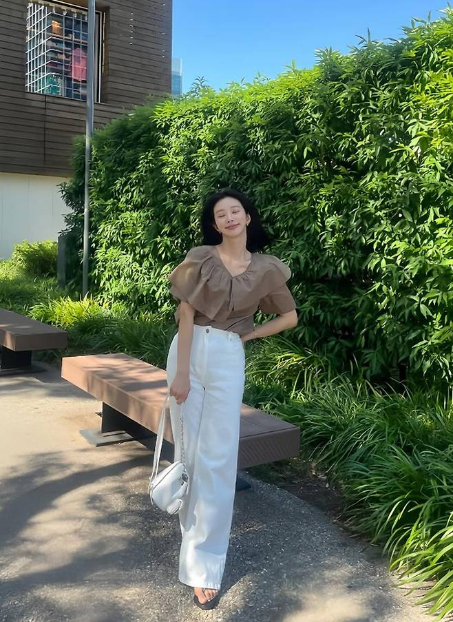 배우 이주빈이 하이웨이스트 팬츠에 케이프 블라우스를 매치한 휴가룩으로 간결하면서도 세련된 여름 스타일을 완성했다.