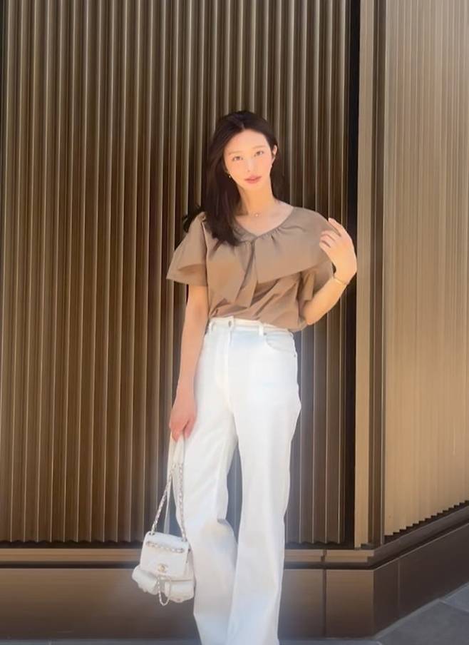 공개한 사진과 영상에서 이주빈은 러블리한 베이지 컬러의 케이프 블라우스와 늘씬한 기럭지가 돋보이는 화이트 팬츠로 스타일리시한 휴가룩을 선보였다.