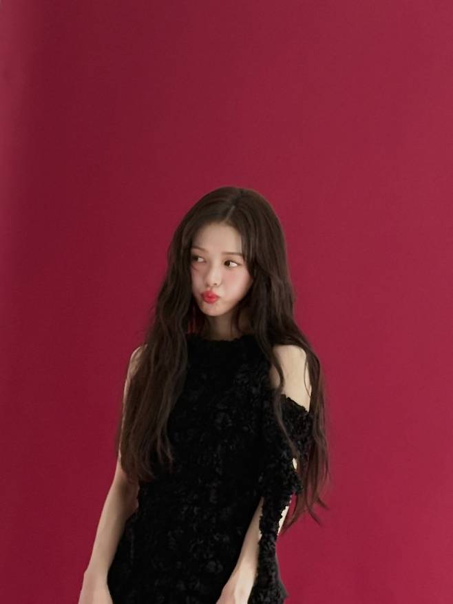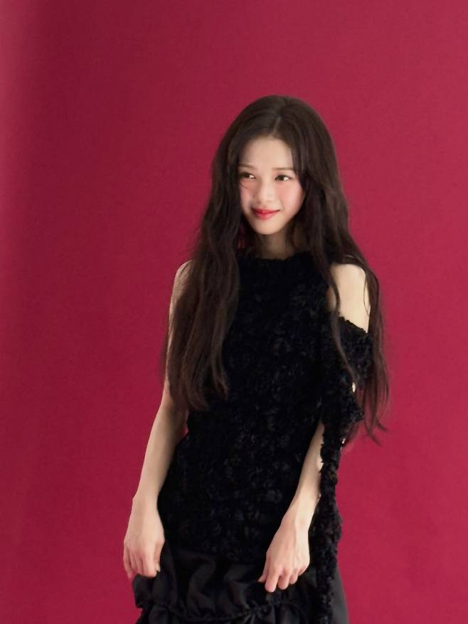 노정의는 강렬한 레드 컬러의 배경 앞에서 신비롭고 고혹적인 매력을 발산하며 보는 이들의 시선을 단숨에 사로잡고 있어요.