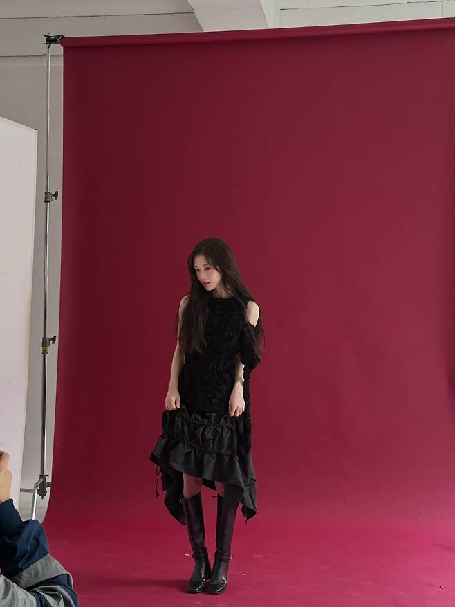 한쪽 어깨를 살짝 드러낸 비대칭 디자인은 그녀의 성숙한 분위기를 배가시키며 마치 화보의 한 장면 같은 드라마틱한 느낌을 자아내고 있어요.