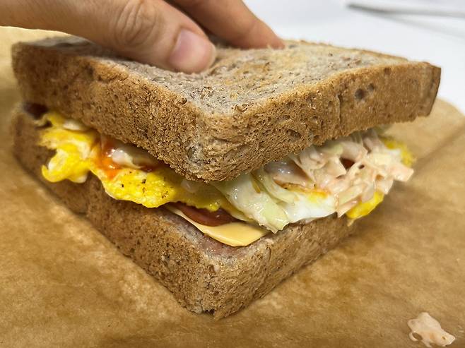 두 번째 방법은 유산지로 샌드위치 포장하는 방법입니다. 랩보다는 종이 재질 자체가 조금 더 두껍고 안정감이 있습니다.