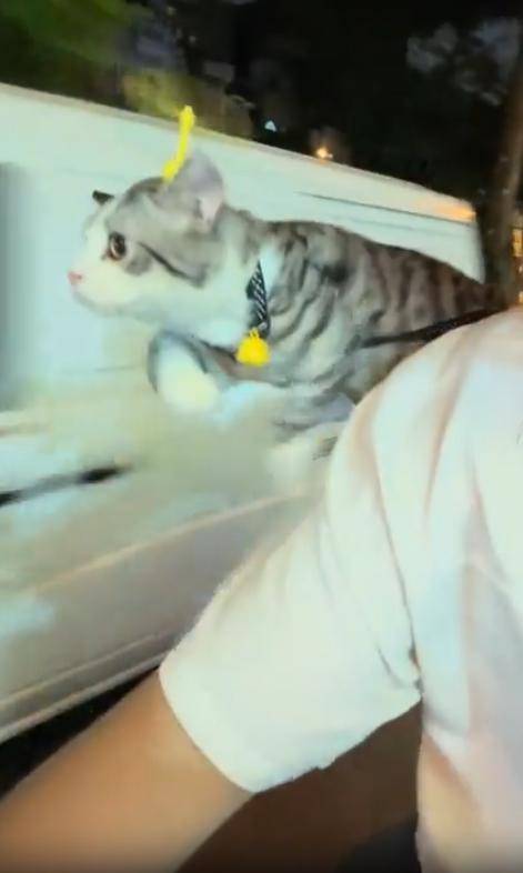 사람이 고양이를 한 손으로 가볍게 받쳐 들자, 고양이는 그 즉시 네 다리를 허공에 휘적이기 시작합니다. 앞발도 뒷발도 쉼 없이 움직이며 마치 자신이 직접 도로 위를 달리고 있는 듯한 착각 속에 빠진 듯하죠.
