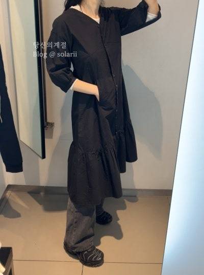 미디 V넥 디자인에 세미 드롭 숄더, 퍼프 스타일 7부 소매, 히든 포켓, 풍성한 프릴까지! 디테일이 살아있는 원피스예요. 버튼이 많아서 살짝 불편하긴 하지만, 이너랑 같이 입을 땐 위에 몇 개는 풀어줘도 예뻐요. 스커트처럼 입고 벗으면 훨씬 편할 것 같아요!