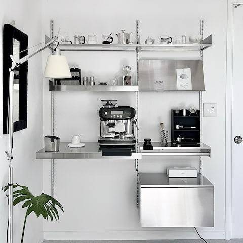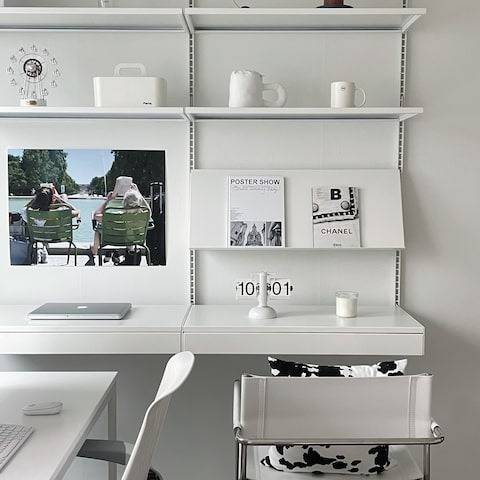 하지만 이때 가장 중요한 건 무게를 견딜 수 있는 튼튼한 고정. 벽이 허용하는 최대 하중을 고려해 프레임 수를 늘리고, 선반 간격을 촘촘하게 조정하면 훨씬 안전하고 견고한 수납이 가능하다.