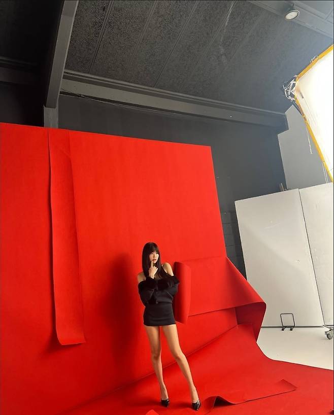 레드 배경 위에 등장한 제니는 벨벳 오프숄더 미니 드레스 하나로 강렬한 아우라를 뿜어냈습니다.
